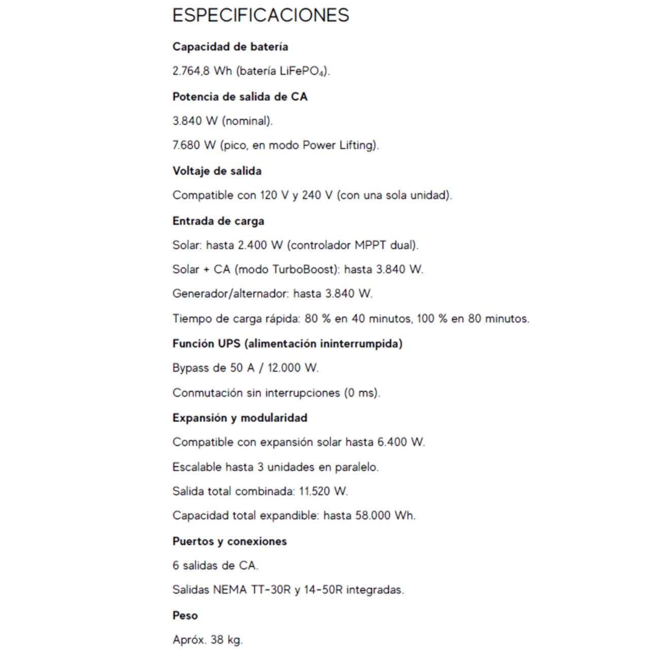 Capacidad de batería 2.764,8 Wh (batería LiFePO₄). Potencia de salida de CA 3.840 W (nominal). 7.680 W (pico, en modo Power Lifting).